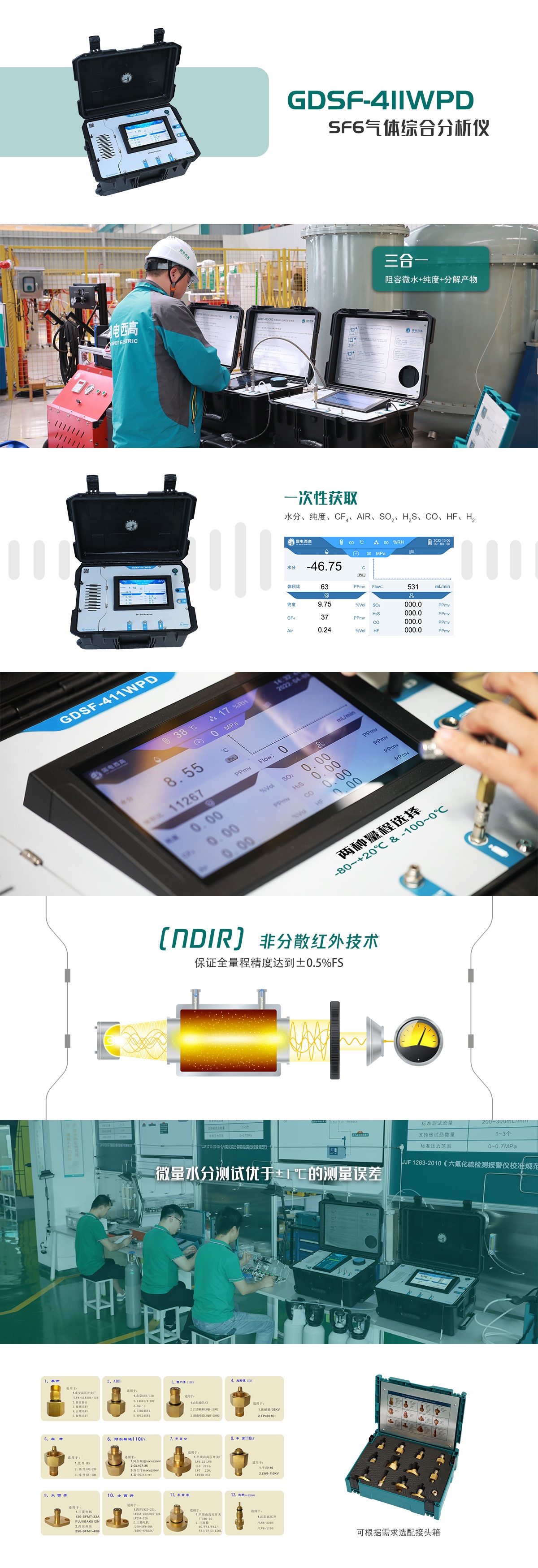 GDSF-411WPD帶泵回  SF6氣體綜合分析儀是集SF6濕度、SF6純度測試以及SF6氣體分解物測試于一體,將原來要用三臺儀器才能實現的功能,集中在一臺儀器。一次現場測量,即可完成所有指標檢測,大大節省了設備中的氣體,同時減少用戶的工作量,提高了工作效率。