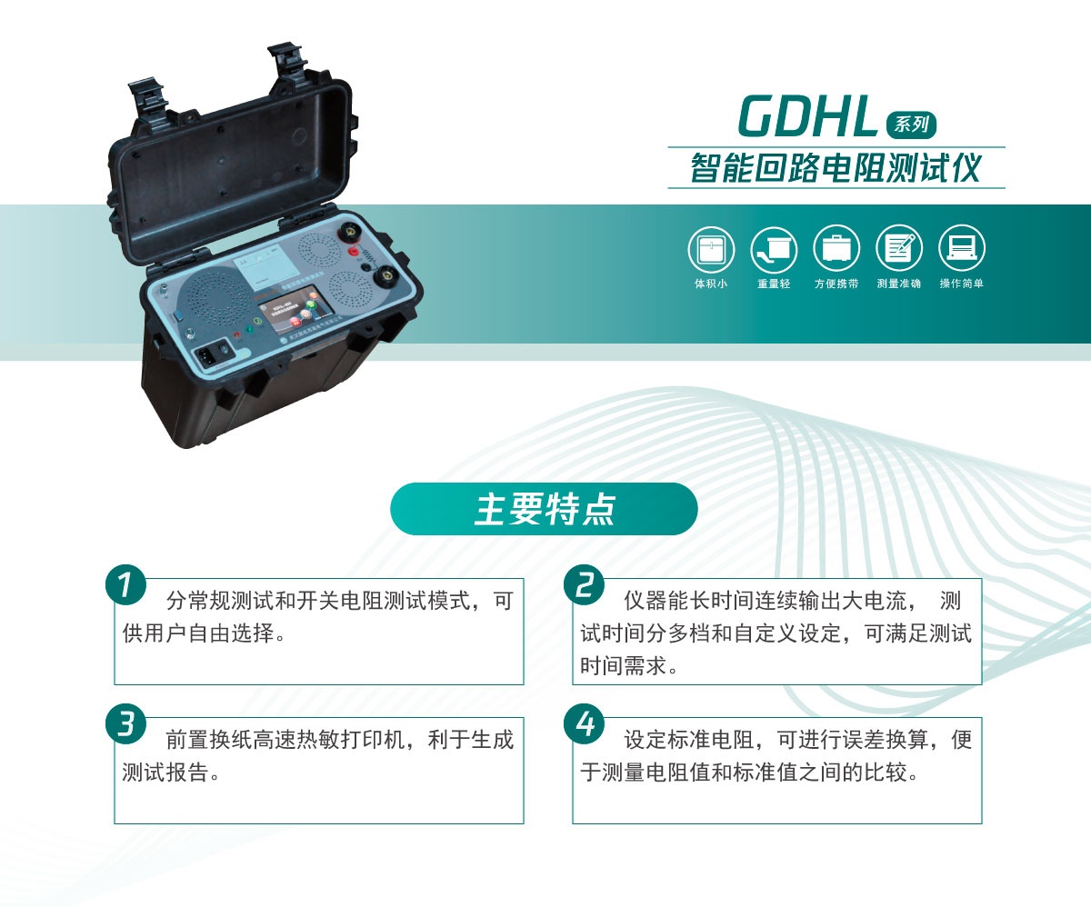 GDHL系列智能回路電阻測試儀采用先進(jìn)的大功率開關(guān)電源技術(shù)和先進(jìn)的電子線路精制而成。是高壓、中壓以及低壓斷路器、開關(guān)回路電阻、大電流匯流排(如銅排、鋁排等)連接點電阻、套管連接處的接點電阻、電纜連接點電阻以及焊接點處電阻等的專用測試儀器。電阻值的測量電流采用國家標(biāo)準(zhǔn)GB736所推薦的不小于100A電流。本儀器具有體積小、重量輕、抗干擾能力強、精度高、操作方便、保護(hù)功能完善等特點。