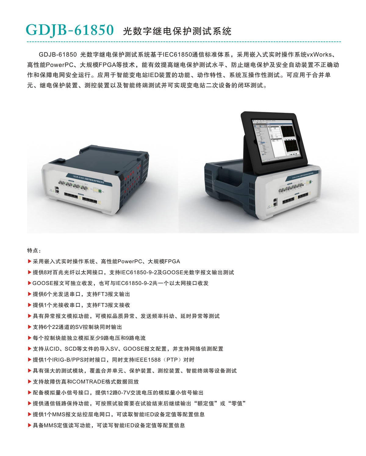 GDJB-61850 光數(shù)字繼電保護(hù)測試系統(tǒng)基于IEC61850通信標(biāo)準(zhǔn)體系,采用嵌入式實時操作系統(tǒng)vxWorks、高性能PowerPC、大規(guī)模FPGA等技術(shù),能有效提高繼電保護(hù)測試水平、防止繼電保護(hù)及安全自動裝置不正確動作和保障電網(wǎng)安全運行。應(yīng)用于智能變電站IED裝置的功能、動作特性、系統(tǒng)互操作性測試??蓱?yīng)用于合并單元、繼電保護(hù)裝置、測控裝置以及智能終端測試并可實現(xiàn)變電站二次設(shè)備的閉環(huán)測試。