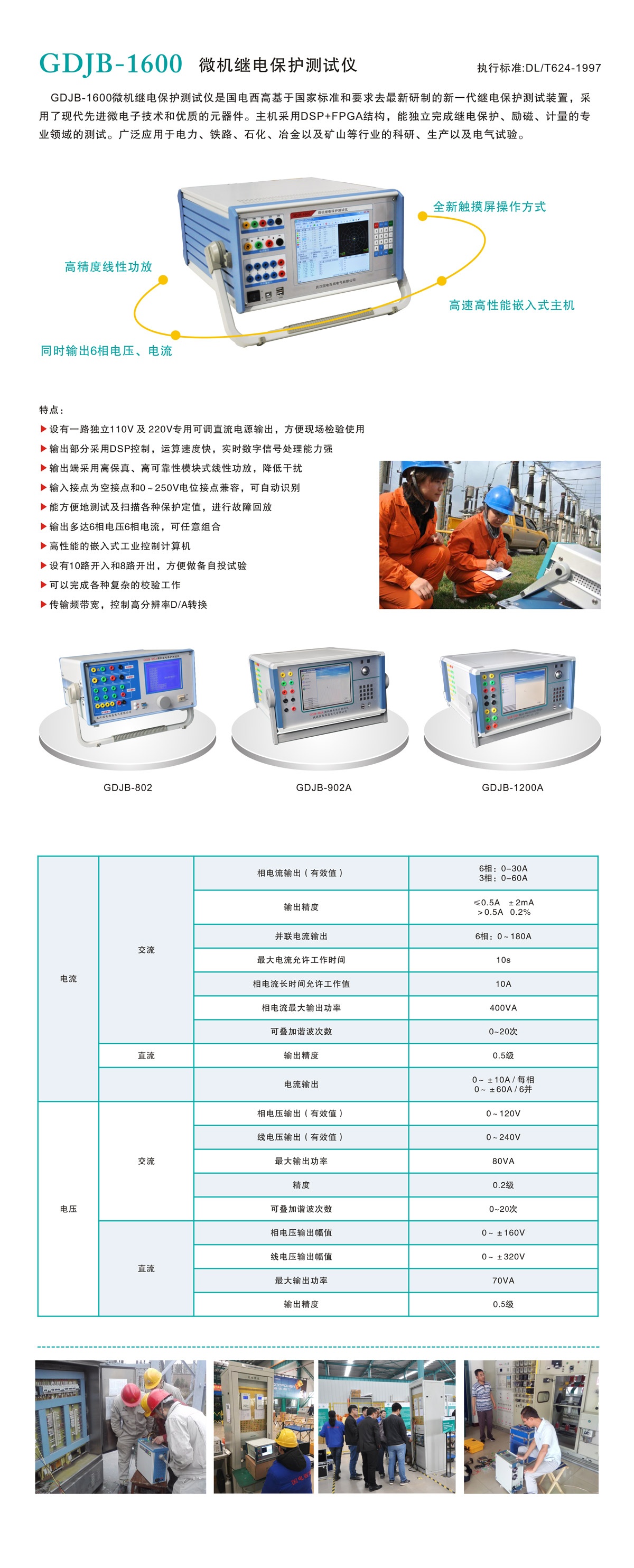 GDJB -1600多功能微機繼電保護測試系統是國電西高公司參照中華人民共和國電力行業標準《DL/T624-1997 繼電保護微機型試驗裝置技術條件》,在廣泛聽取用戶意見和GDJB-1200的基礎上,認真總結多年積累的產品開發和生產經驗,采用目前最新的電子技術研制的新一代微機繼電保護測試裝置,可以獨立完成繼電保護、勵磁、 計量等專業領域內的裝置和元器件測試調試,微機繼電保護測試儀廣泛適用于電力、鐵路、石化、 冶金和礦山等行業的科研、生產和電氣試驗現場。