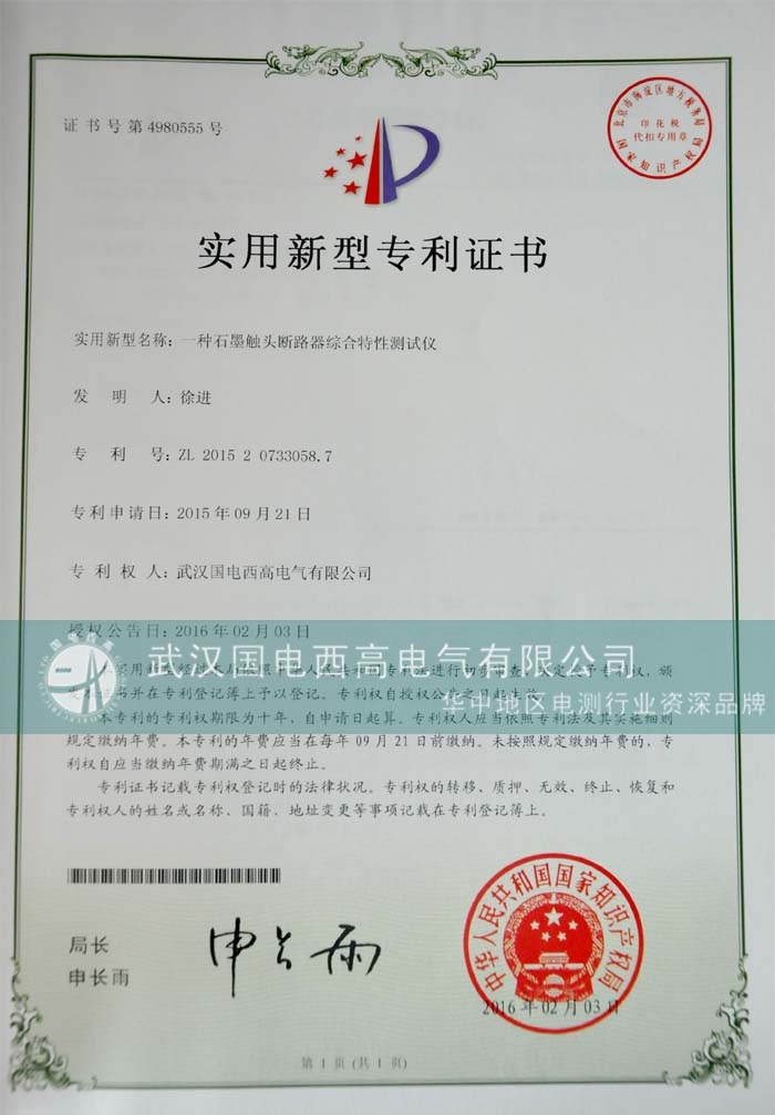 2016年8月10日,武漢國電西高電氣有限公司榮獲中華人民共和國國家知識產權局頒發的“一種步進式絕緣電阻測試裝置”和“一種石墨觸頭斷路器綜合特性測試儀”兩項實用新型專利證書,在此我們表示熱烈的祝賀。