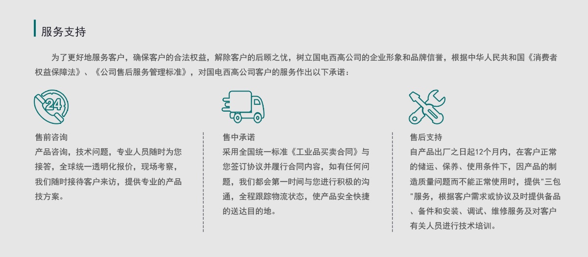 自產品出廠之日起12個月內,在客戶正常 的儲運、保養、使用條件下,因產品的制 造質量問題而不能正常使用時,提供"三包 "服務,根據客戶需求或協議及時提供備品 、備件和安裝、調試、維修服務及對客戶 有關人員進行技術培訓。