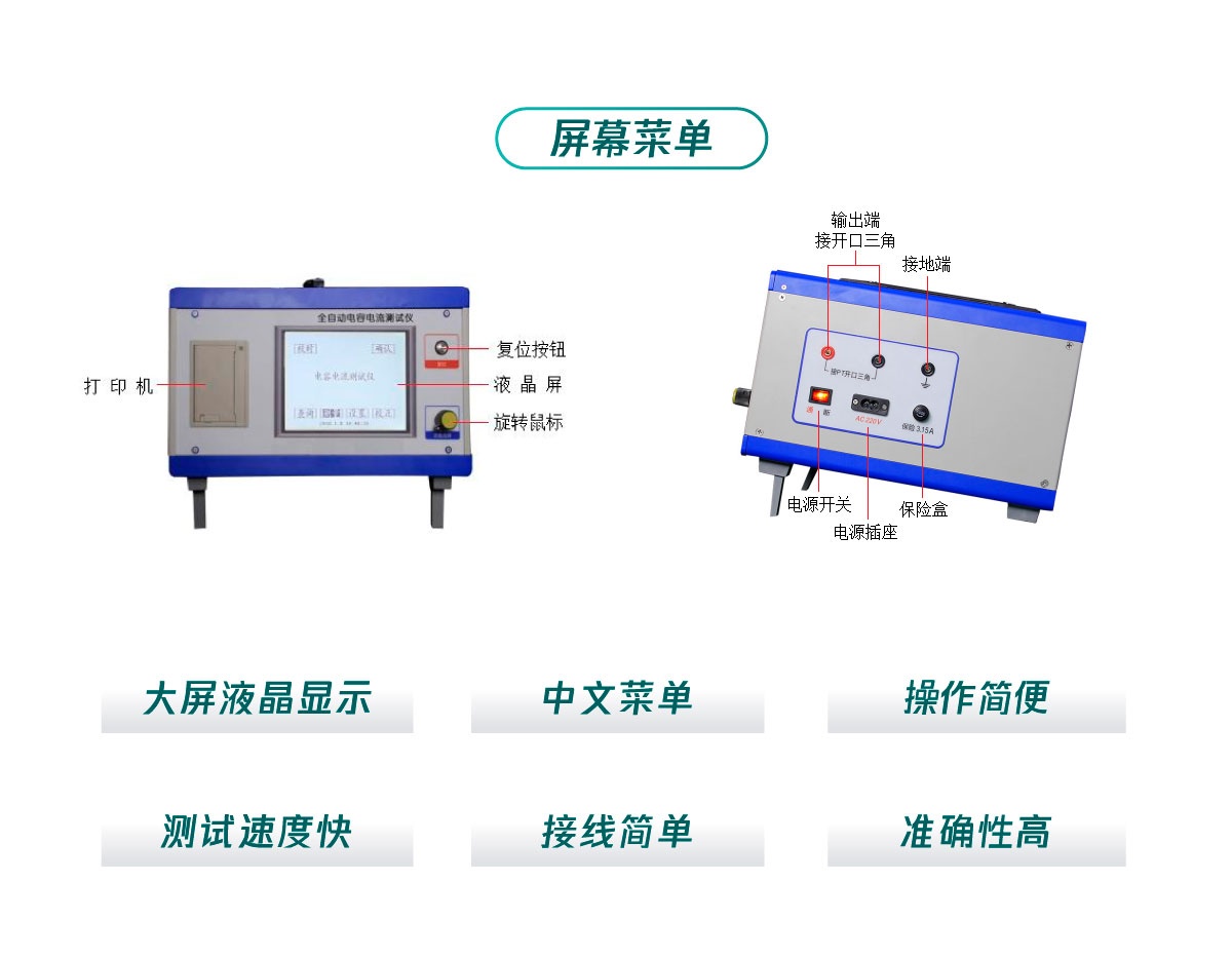 · 測試儀采用大屏幕液晶顯示,中文菜單,操作非常簡便,且體積小、重量輕,便于攜帶進行戶外作業,接線簡單,測試速度快,數據準確性高,大大減輕了試驗人員的勞動強度,提高了工作效率。
