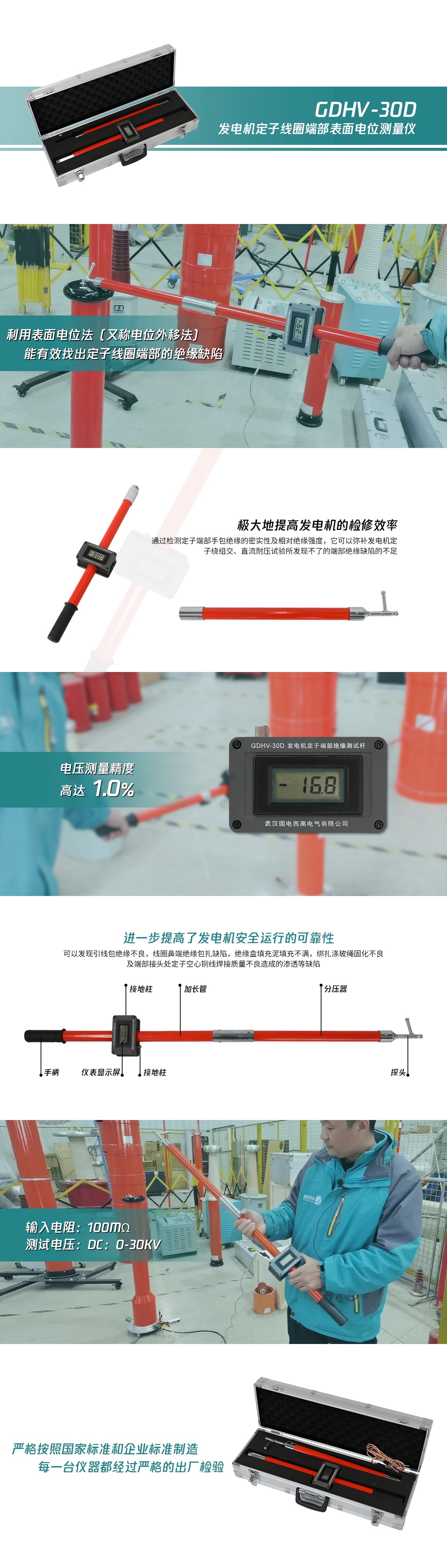 GDHV-30D發電機定子端部絕緣測試桿是完全滿足(電力工業部和機械工業部下達了安生技(1994)86號文件)的高科技產品,它的投入使用,極大地提高了發電機的檢修效率。