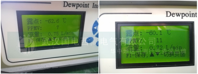 GDWS-242 SF6微水測(cè)量?jī)x進(jìn)行檢測(cè)時(shí),先用高純氮清洗測(cè)量管道,通過(guò)調(diào)節(jié)測(cè)量管道上的針型閥,流量調(diào)節(jié)到0.75L/min,測(cè)出數(shù)據(jù):7ppmv;后續(xù)還對(duì)SF6新氣微水值也做了同樣測(cè)量,得出結(jié)果為11ppmv。兩項(xiàng)試驗(yàn)均符合標(biāo)準(zhǔn)。