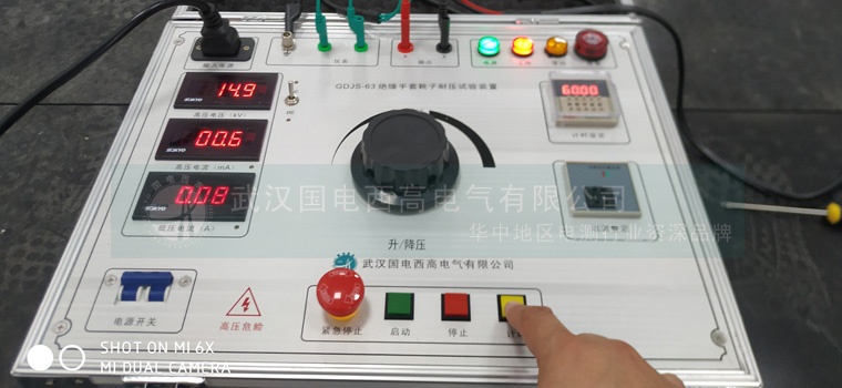 在進行絕緣安全工器具的耐壓試驗時,我們用耐壓試驗裝置對其絕緣手套和絕緣靴分別做了試驗電壓8kV和15kV耐壓一分鐘的試驗,結果均達到國家標準,試驗通過。